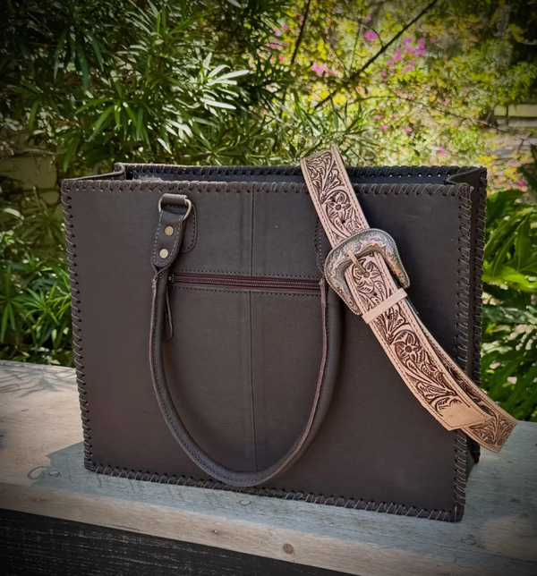 Tooled Leather And Cowhide Crossbody tote shoulder handbag zipper closure fully lined multiple compartments comes with detachable and adjustable crossbody strap 15" x 12" x 5"